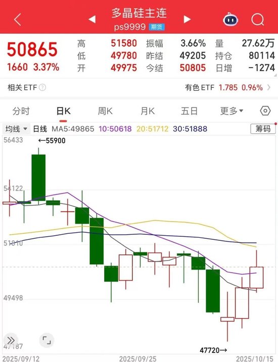 从现货来看,李祥英认为,前期多晶硅期货价格快速下跌,2511合约跌破47720元/吨,而国庆节后地区价格小幅上涨,盘面贴水看的较大,这也给了目前期货价格的支撑。数据显示,10月15日,多晶硅现货价格企稳,n型致密料均价5万元/吨。