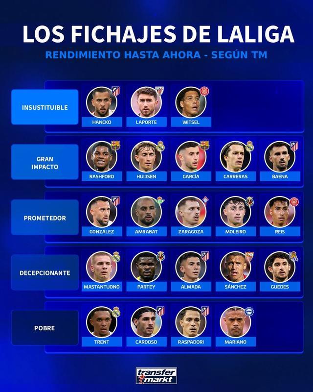 北京时间12月24日,德专盘点了今年夏天西甲的一些关键转会。其中,汉兹科、拉波尔特和维特塞尔被评为不可替代,拉什福德、休伊森等人被评为一流,马斯坦托诺被评为令人失望,亚历山大-阿诺德被评为表现令人失望。德意志银行评论今年夏天从洪到拉的重要西甲转会:洪(不变)汉兹科(马德里竞技),艾默里克·拉波尔特(毕尔巴鄂竞技),维特塞尔(赫罗纳)顶级(影响力大)拉什福德(巴塞罗那),休伊森(皇家马德里),胡安·加西亚(巴塞罗那),阿尔瓦罗·卡雷拉斯(皇家马德里),巴埃纳(马德里竞技)仁尚仁(未来)尼古拉斯·冈萨雷斯(马德里竞技)、索菲扬·阿姆拉巴特(皇家贝蒂斯)、萨拉戈萨(塞尔塔·维戈)、莫雷罗(比利亚雷亚尔)、维托·雷斯(赫罗纳) NPC(令人失望)马斯坦托诺(皇家马德里)、帕泰伊(比利亚雷亚尔)、蒂亚戈·阿尔马达(马德里竞技)、桑切斯(塞维利亚)、贡萨洛·格德斯(皇家)皇家社会队)然后(表现不佳)亚历山大-阿诺德(皇家马德里队)d)、约翰尼·卡多佐(马德里竞技)、拉斯帕多里(马德里竞技)、马里亚诺·迪亚斯(阿拉维斯)